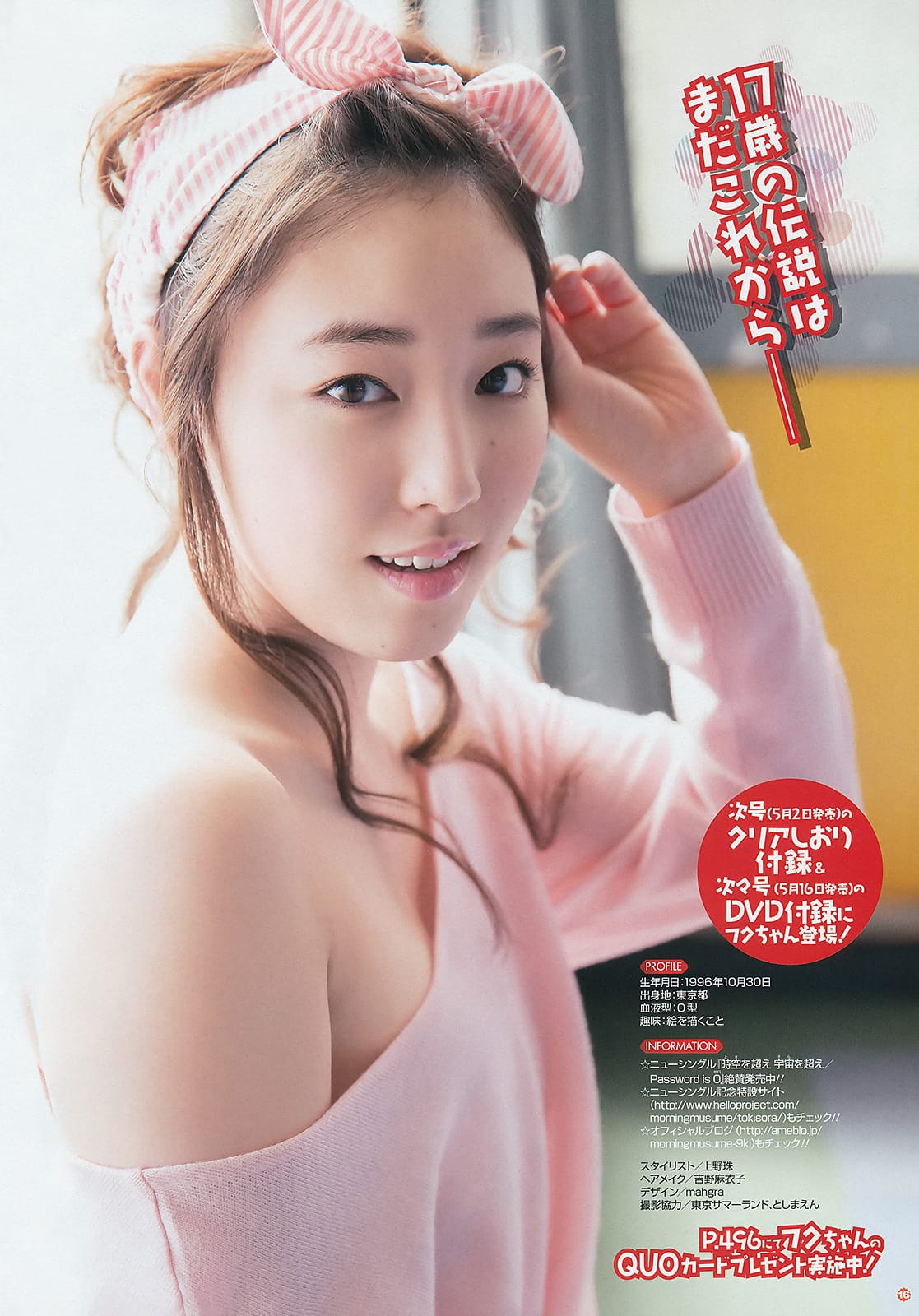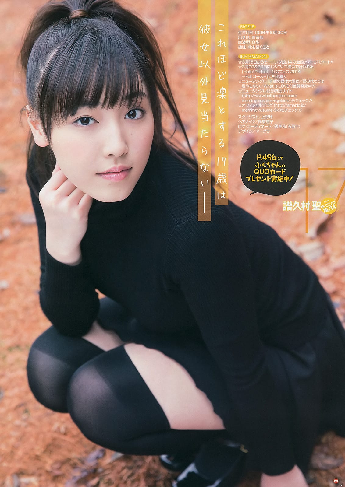 譜久村 聖(ふくむら みずき、1996年10月30日生まれ)は、日本の歌手であり、女性アイドルグループ・モーニング娘。の元メンバー(9期)です。彼女は9代目リーダーおよびハロー!プロジェクトの7代目リーダーを務めました。愛称は「ふくちゃん」で、イメージカラーはホットピンクです。
