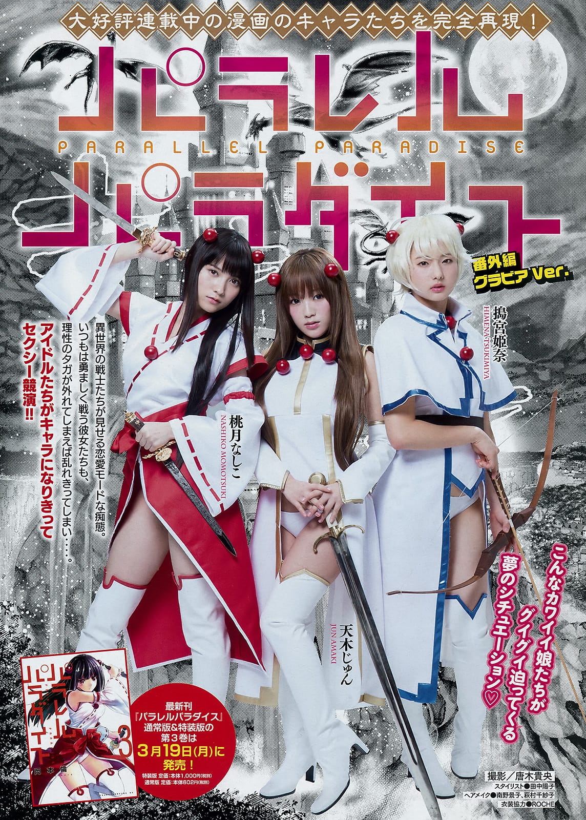 漫画「パラレルパラダイス」の世界をリアルに再現した、桃月なしこ、鳩宮姫奈、天木じゅんによるグラビア特集がファンの間で話題沸騰中です。2018年に撮影されたこのセッションは、彼女たちが漫画のキャラクターに扮し、水着姿で魅了しています。