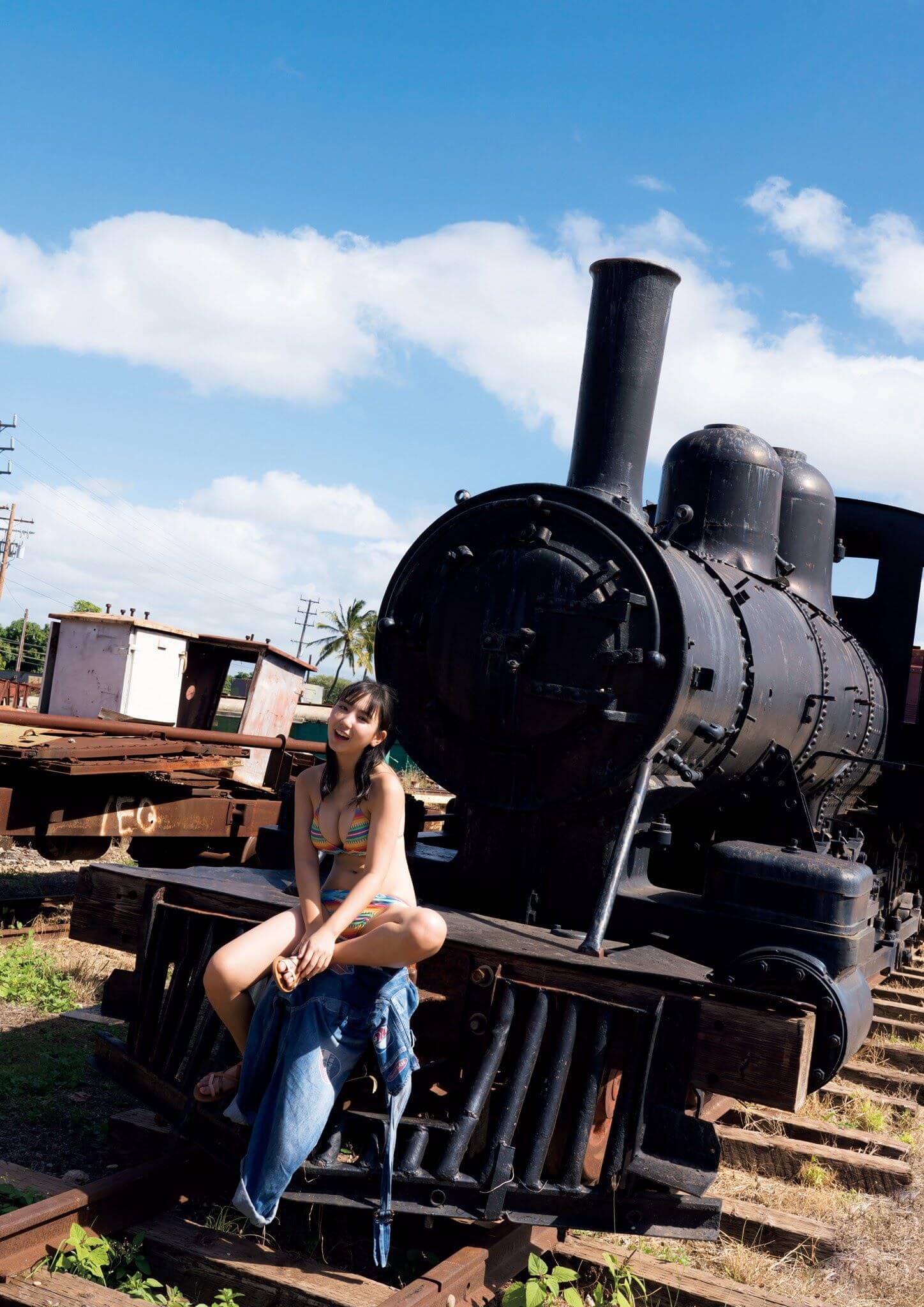 – 青空と海を背景にした撮影で、健康的で自然体な魅力を披露。
