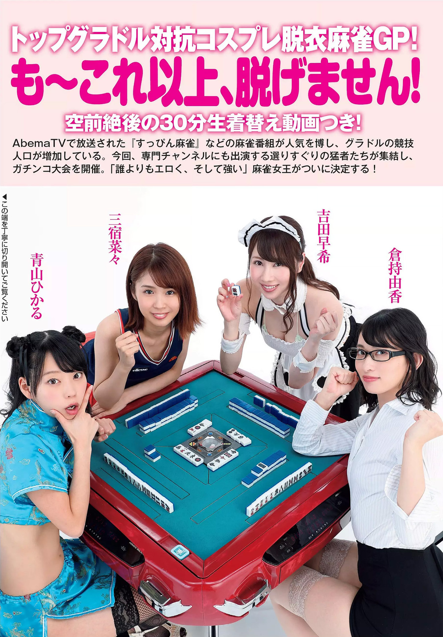 AbemaTVが提供する『すっぴん麻雀』をはじめとする麻雀関連のエンターテイメント番組が、視聴者からの高い関心を集めています。この流れを受けて、グラビアアイドルたちが参加する麻雀大会「トップグラドル対抗コスプレ脱衣麻雀GP」が開催されました...